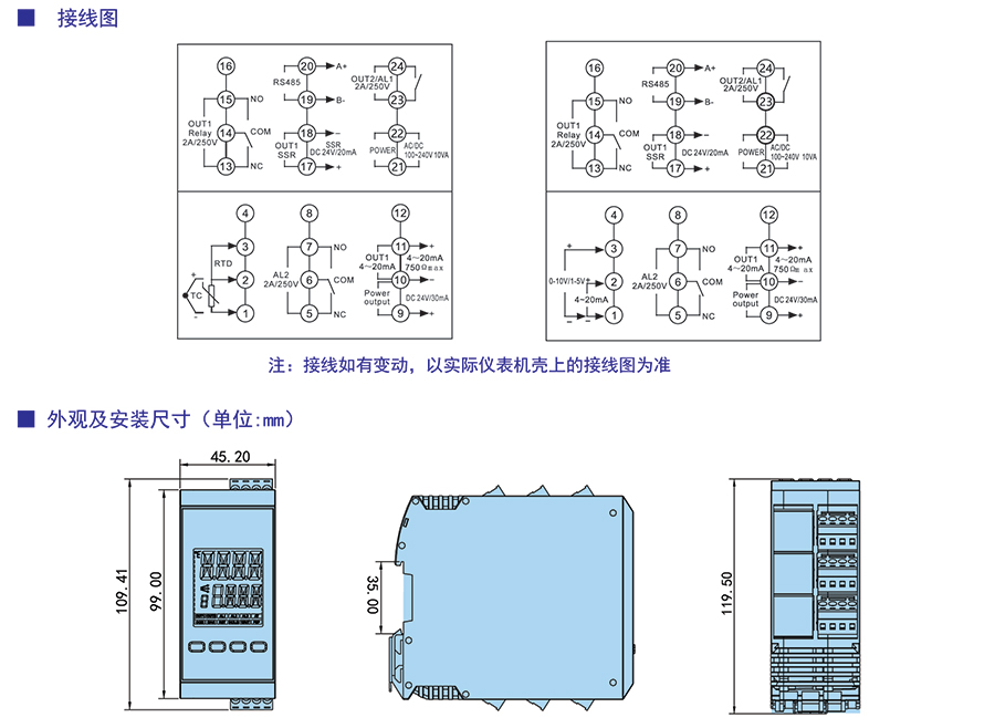 具有测量显示、控制输出、报警输出、变送输出、RS485通讯等功能