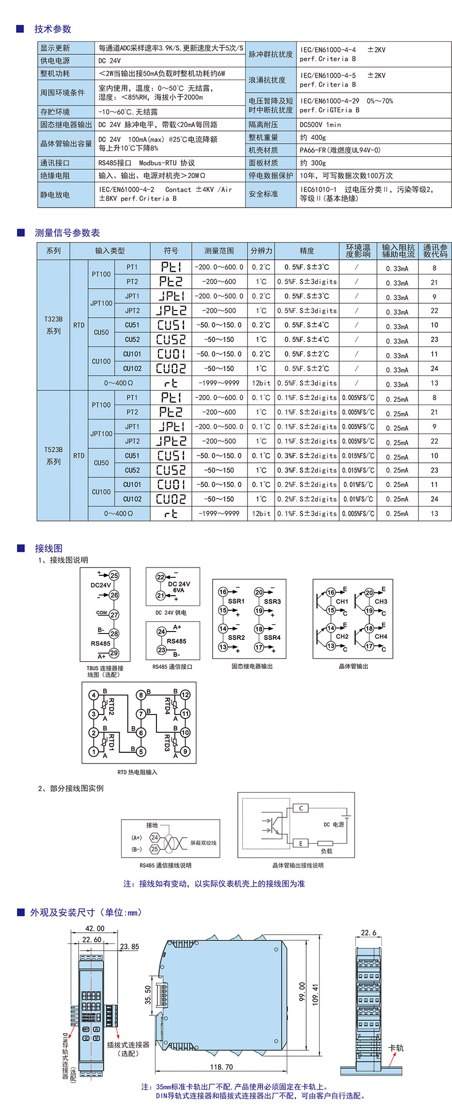 多种热电阻信号类型可选,信号输入间弱隔离,可接地式探头;三线式热电阻输入。