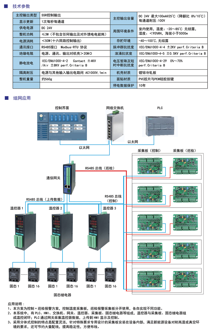 两路RS485,一路上传数据到PLC等上位机,一路接采集板接收采样温度值