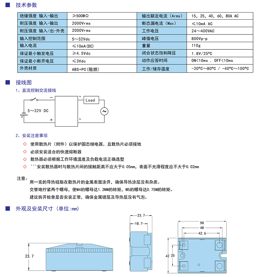 采用光电耦合隔离,输入-输出-散热片之间耐压强度达2kV